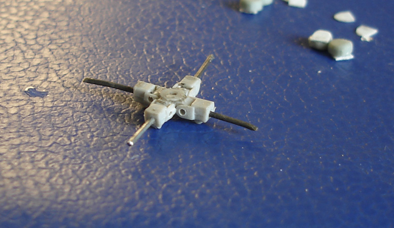 Думал я, думал... и всё-таки решился на более глубокую деталировку втулок и лопастей, не смотря на близкий финиш ГБ. Вырезал из литника кружки, просверлил и закрепил суперклеем будущие шланги.